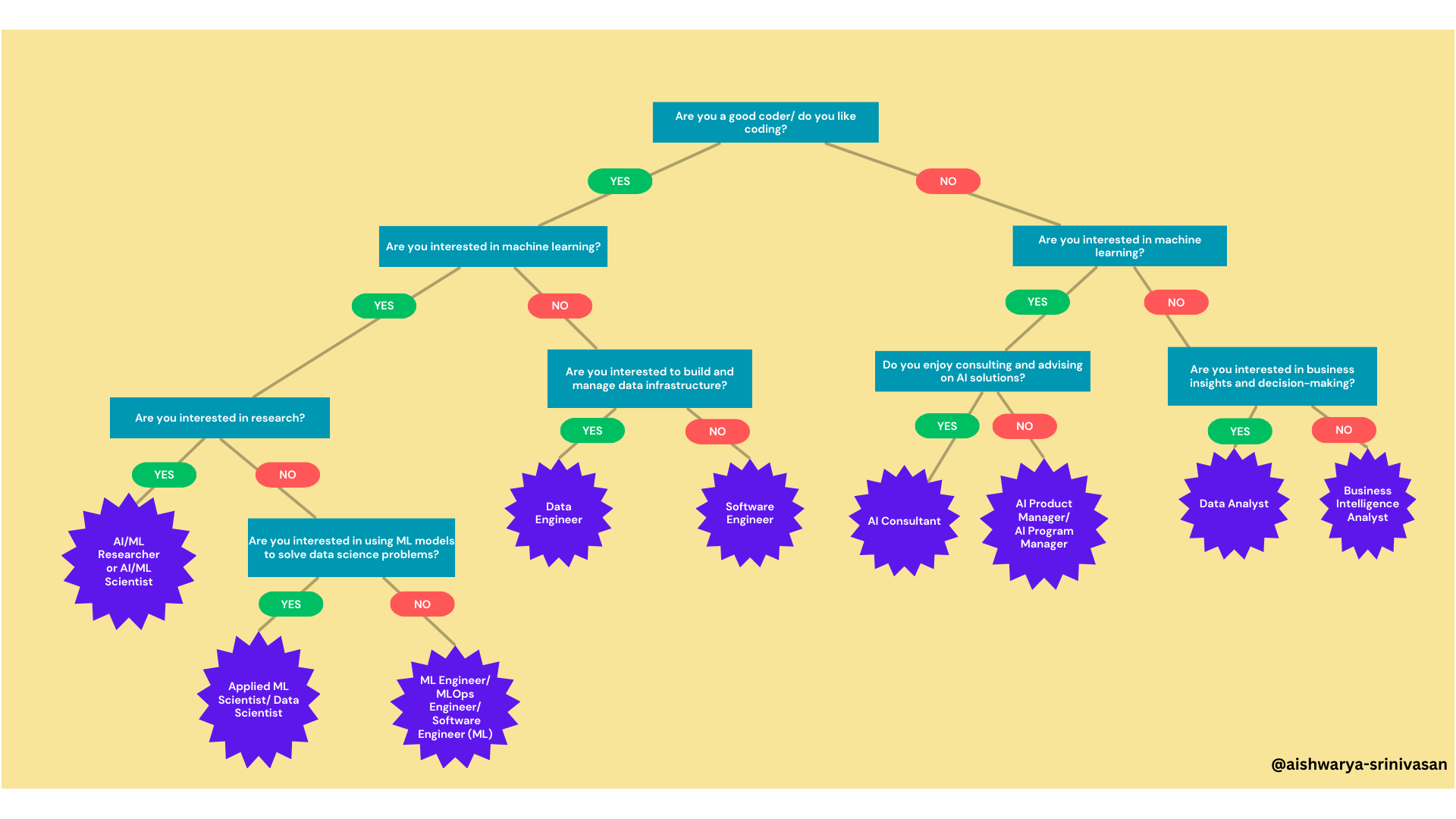 The path to an AI career begins with a self-assessment. The first decision point is whether you consider yourself a skilled coder or if you prefer to focus on data-driven analysis. The flow chart in Figure 1 (below) provides a helpful guide to match your interests and abilities to the appropriate AI role.